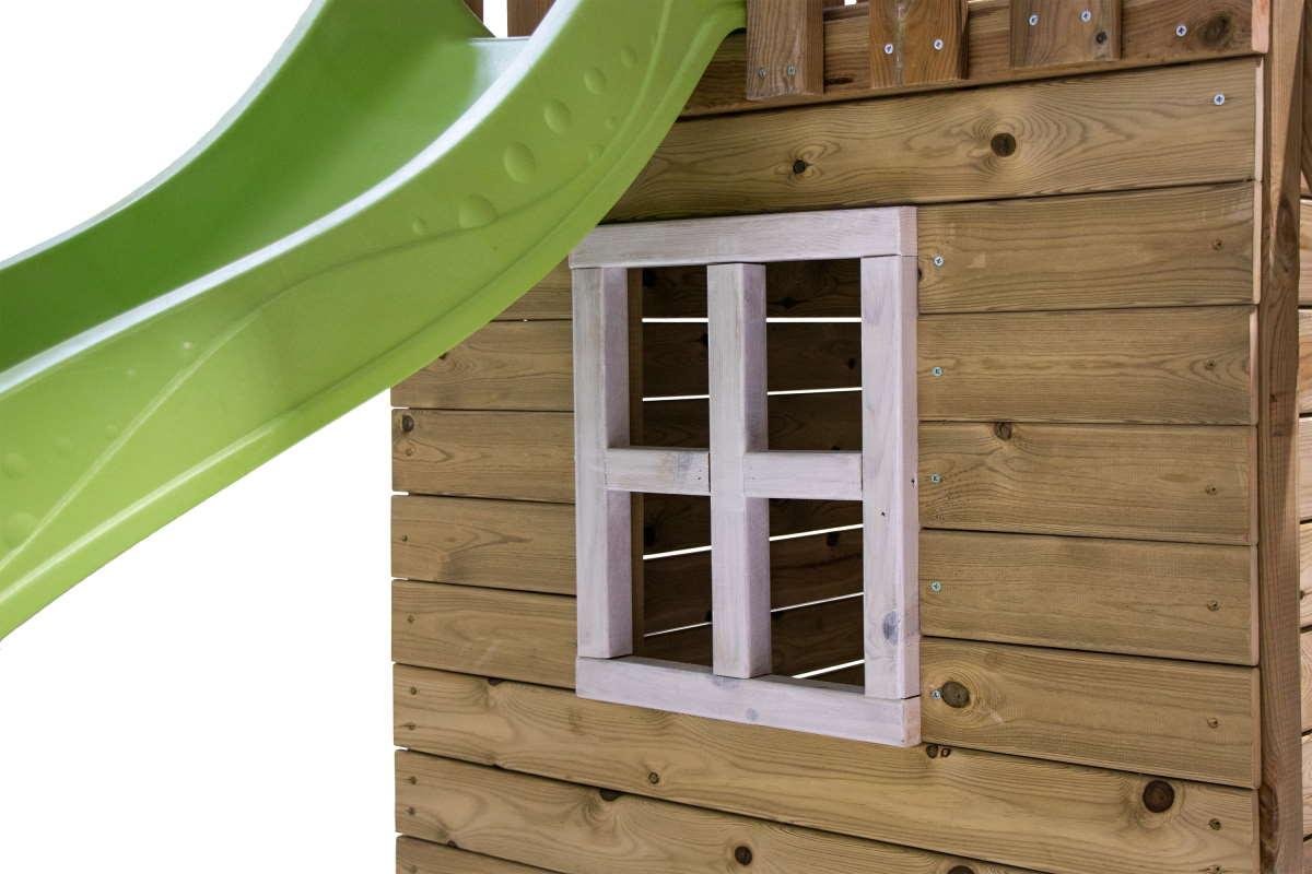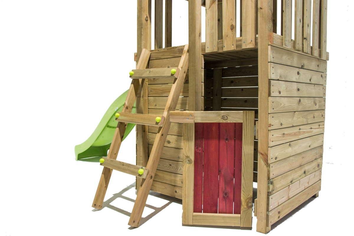 El Parque infantil Tibidabo con casita y columpios, de la marca MASGAMES, es una torre de madera cuadrada fuerte y muy bonita para su jardín. Su estructura alberga una casita en toda la mitad inferior. La casita, cuyo techo es a la vez el piso de 120 cm de altura por el que bajar por el tobogán, es ideal para que los más pequeños se refugien, jueguen y sueñen con mil aventuras. También podrán guardar en ella sus juguetes. La casita cuenta con una puerta de media altura que, junto con la ventana que hay en uno de los laterales, permite la entrada de mucha luz para que los niños puedan jugar durante horas. Las maderas de la casita dan, a su vez, mucha resistencia y estabilidad al conjunto del parque.