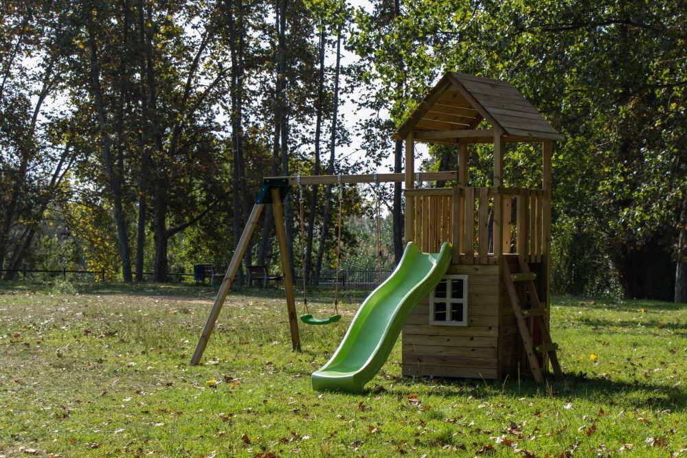 En un lateral reposa una estructura de columpio doble de madera cuadrada con dos asientos de columpio que soportan hasta 70kg cada uno. La Torre Tibidabo con columpio doble suma un extra de diversión para los niños y completa mucho más este ya de por sí divertido parque.