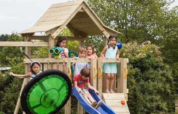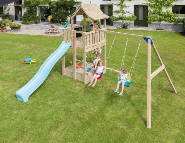 El parque infantil Torre Pagoda de la marca Blue Rabbit es una torre de madera cuadrada fuerte y bonita para su jardín, además tiene un columpio de dos asientos para augmentar la diversión de los niños.