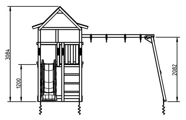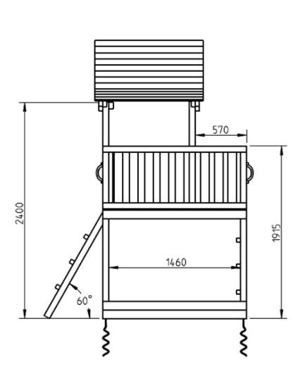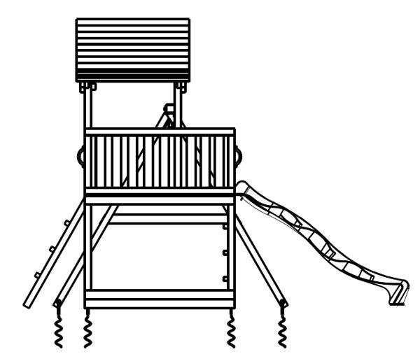 Este parque infantil Pagoda con columpio doble consiste en una casita de madera elevada, la torre infantil dispone de dos tipos de escaleras que ayudarán a los niños a subir a la caseta infantil elevada. Una de las escaleras es en vertical (parte delantera) y la otra está inclinada, situada en la parte trasera de la torre infantil. Una vez arriba pueden jugar, vigilar, mirar, descansar, entre otras muchas cosas. Para bajar de la torre infantil Pagoda se utiliza un super tobogán, que rápidamente les conducirá a tierra. El columpio doble está apoyado a la torre infantil y lleva dos asientos.