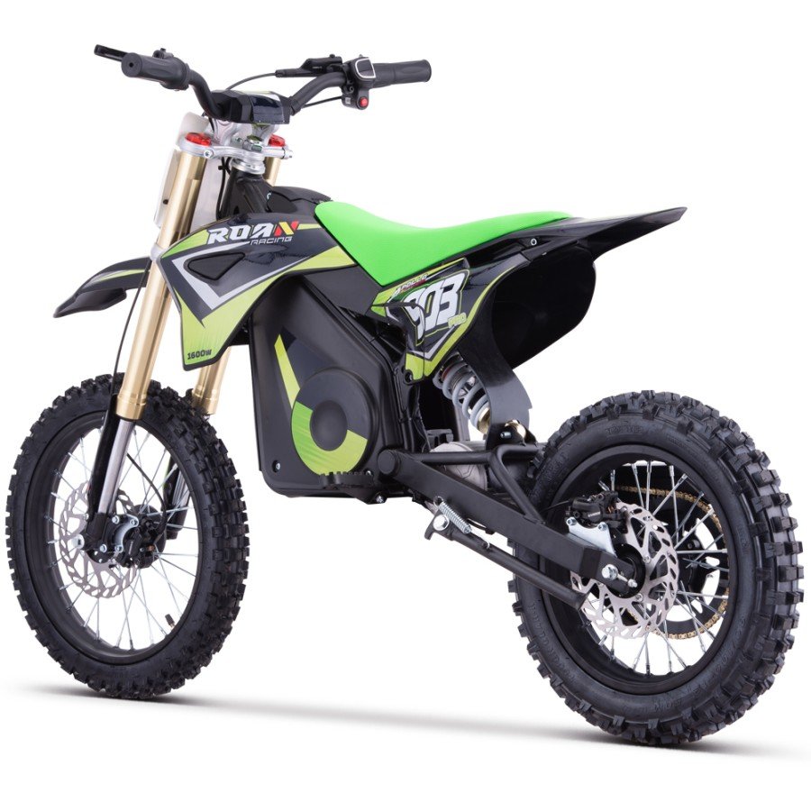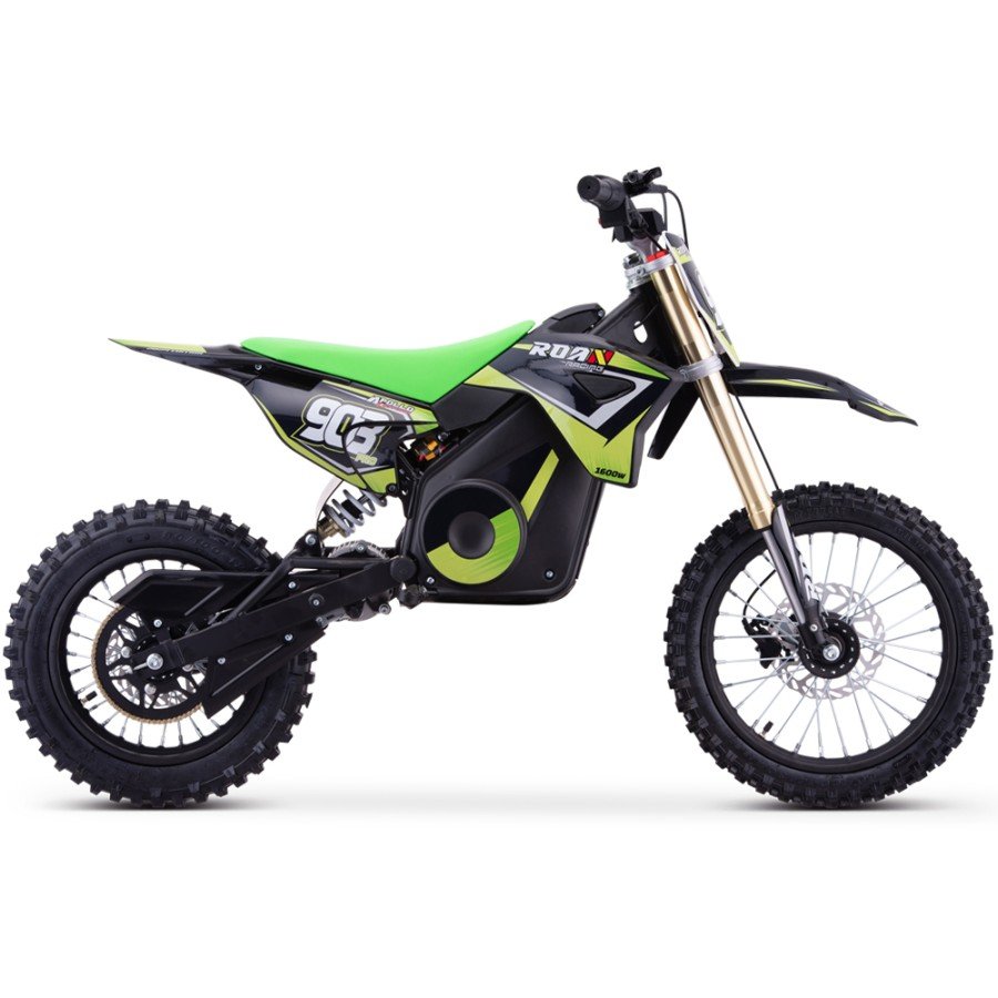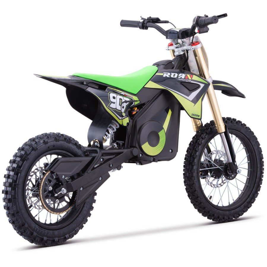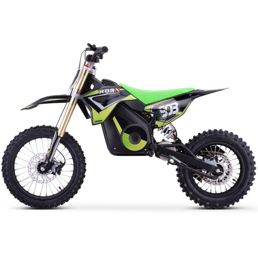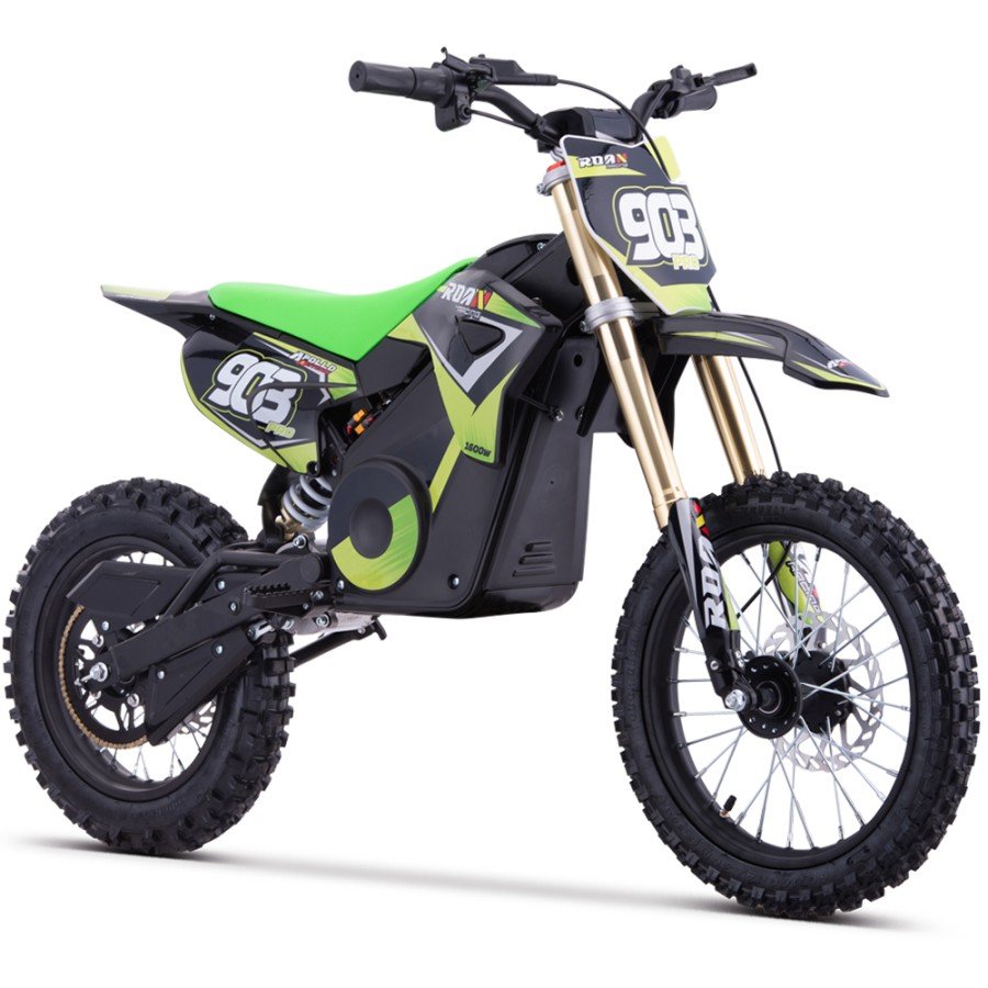 Pit bike eléctrica 1600W motor brushless con limitador de velocidad, fuerza de salida y potencia. Más alta, con 70 cm de altura del suelo al asiento y mejor maniobrabilidad con sus llantas 14/12″ y frenos hidráulicos.