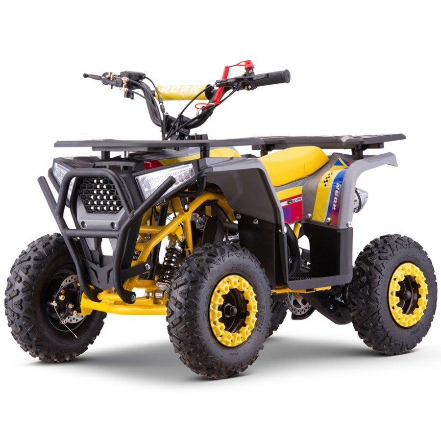 El mini quad Roan Bull 49cc está diseñado con un chasis reforzado que soporta hasta 70 kg de peso, lo que lo convierte en una opción duradera y resistente para los pequeños pilotos. Sus dimensiones de 103 cm de largo, 62 cm de ancho y 68 cm de alto (hasta el manillar) permiten que los niños se sientan seguros y cómodos mientras lo conducen. Además, este modelo cuenta con un limitador de velocidad, que es una característica esencial para que los padres puedan controlar el rendimiento del quad y asegurarse de que la velocidad sea adecuada para los más pequeños.