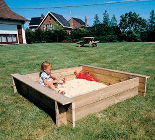 Un bonito arenero de madera con un excelente acabado.