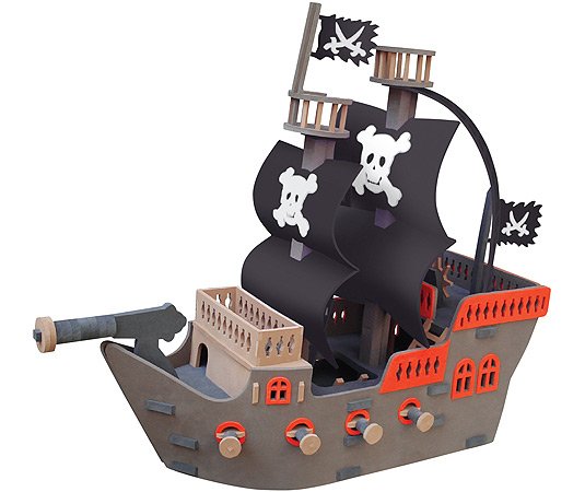 Un barco pirata de grandes dimensiones con sus velas, sus banderas y su cañón. Se divertirán armando el barco, como si de verdaderos armadores se tratase y después surcando todos los mares de su imaginación.